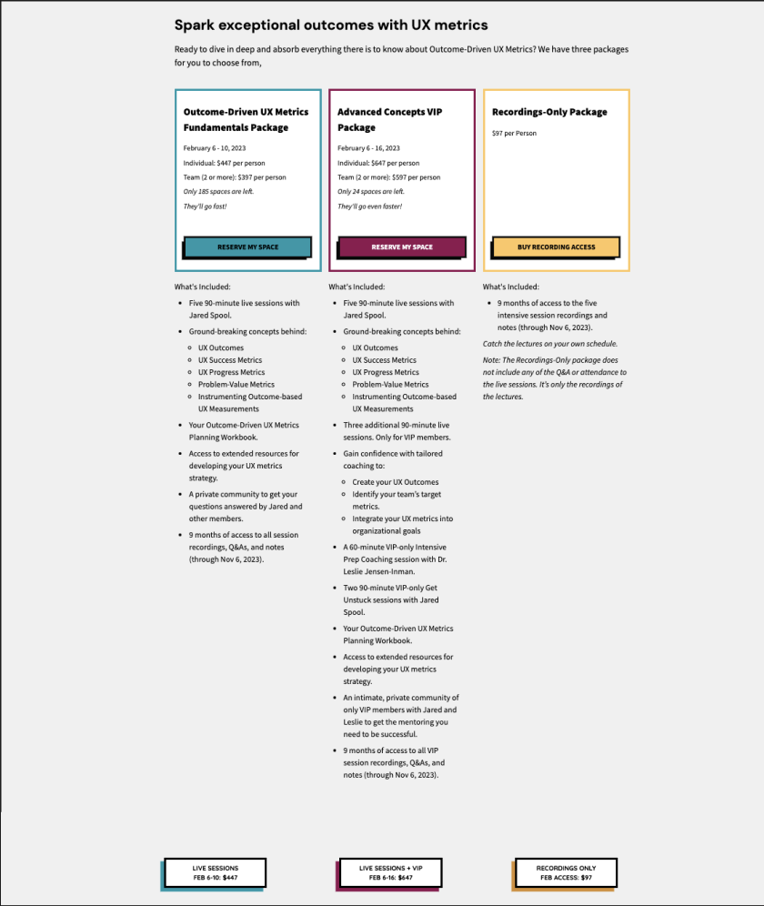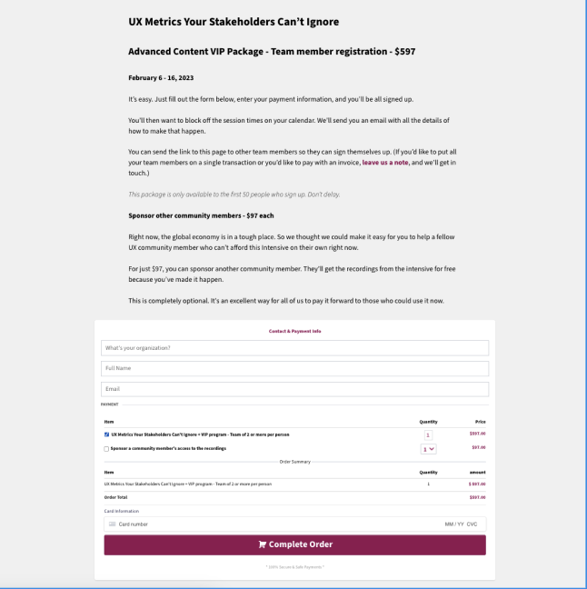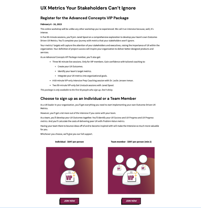 CC provides online training sessions to larger organizations with in-house UX teams. On February 6th, 2023, the company was planning to launch a 5-day long, paid webinar.
